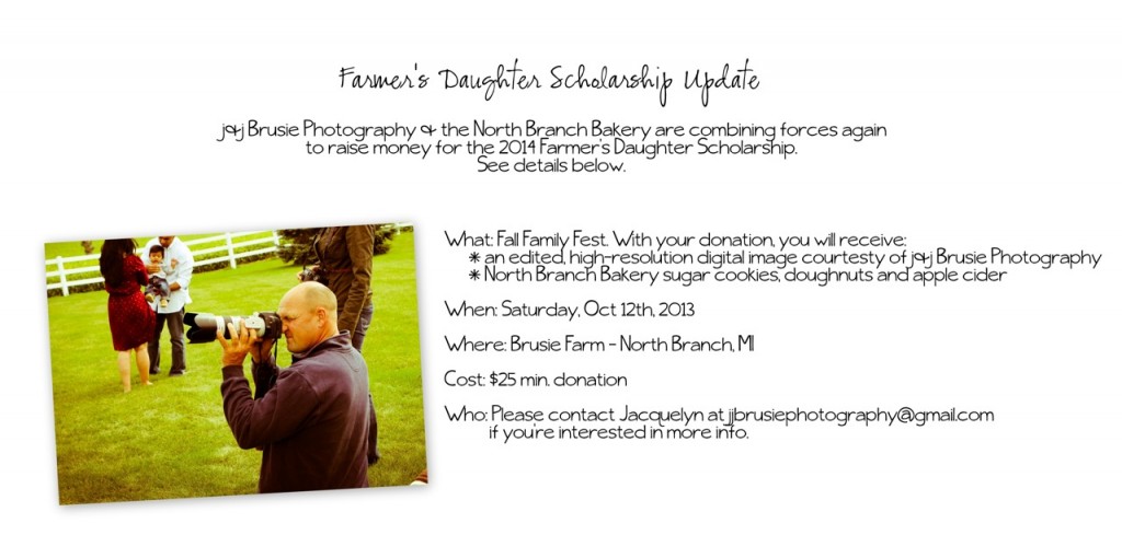 Next month, J & J Brusie Photography is one again teaming up with the North Branch Bakery to offer family fun on the farm, professional photography and fresh-baked goodies to raise money for the 2014 Farmer’s Daughter Scholarship fund.